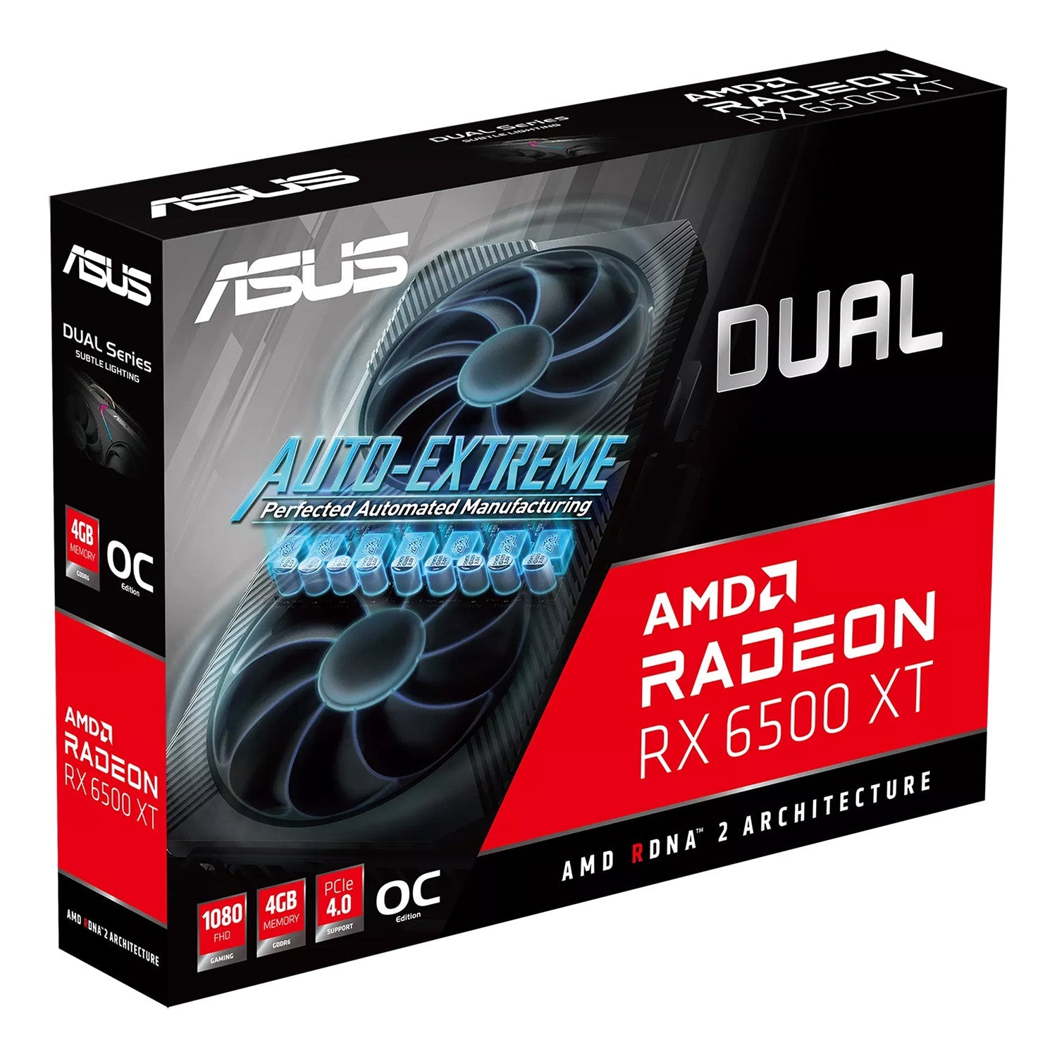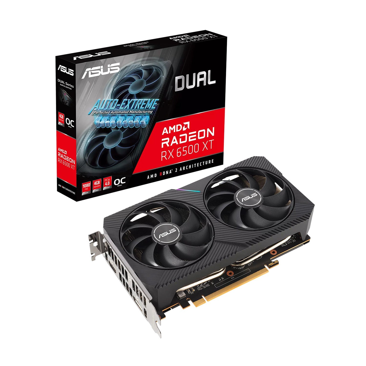 - ASUS Dual Radeon RX 6500 XT OC Edition 4GB GDDR6 with two powerful Axial-tech fans and a 2-slot design for broad compatibility.