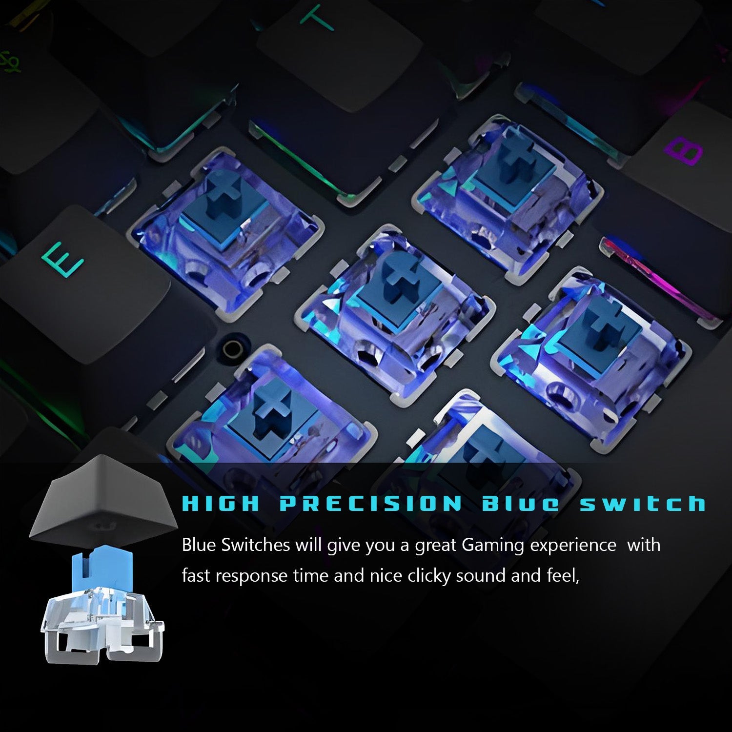 - BLUE SWITCHES: This compact gaming keyboard is with blue switches that offer accurate feedback and fast action with real tactile feeling and audible click sound,
