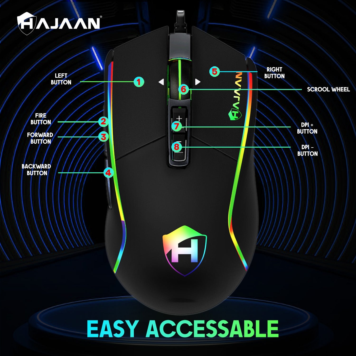 - Experience maximum control over your game with the HAJAAN Gaming Bundle. It comes with a multifunctional RGB gaming keyboard, RGB backlit gaming mouse, and gaming mouse pad so you have everything you need to ensure precision shots, stealth moves, and rapid combos to take down your opponent.