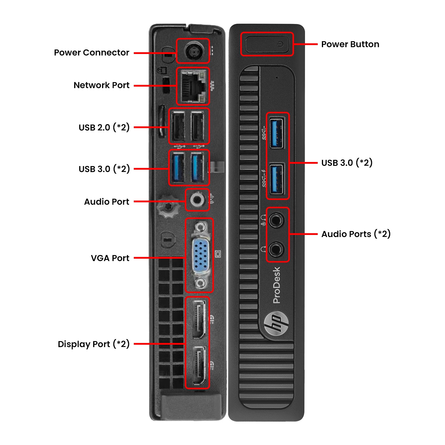 • Connectivity Ports: Multiple USB ports, 2x Display ports, Ethernet (RJ-45), VGA Port, Power Connector, Audio ports.