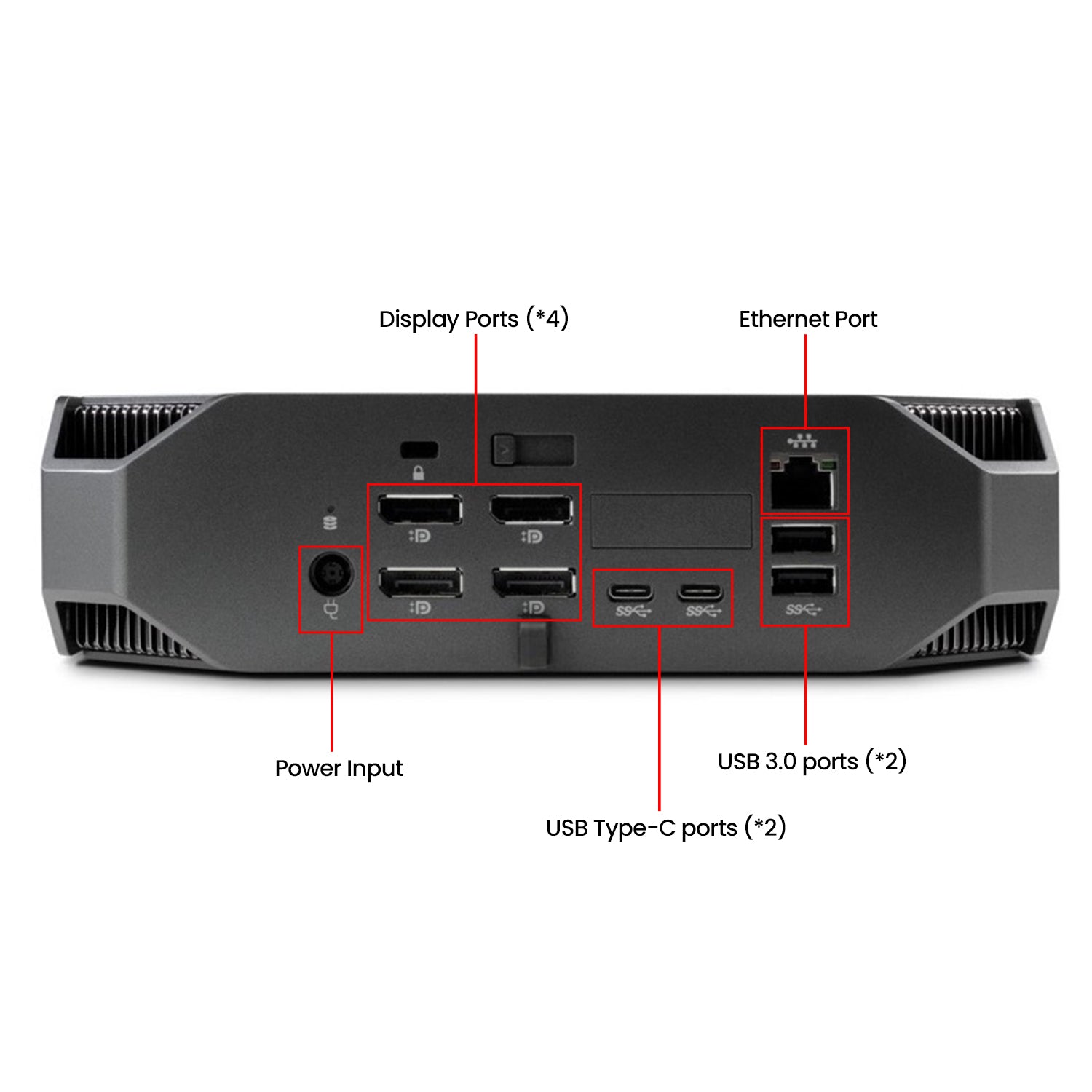 - Connectivity: Including 4x Display ports, Ethernet (RJ-45), Multiple USB ports, Type-C Port, Audio Port, Power Connector.