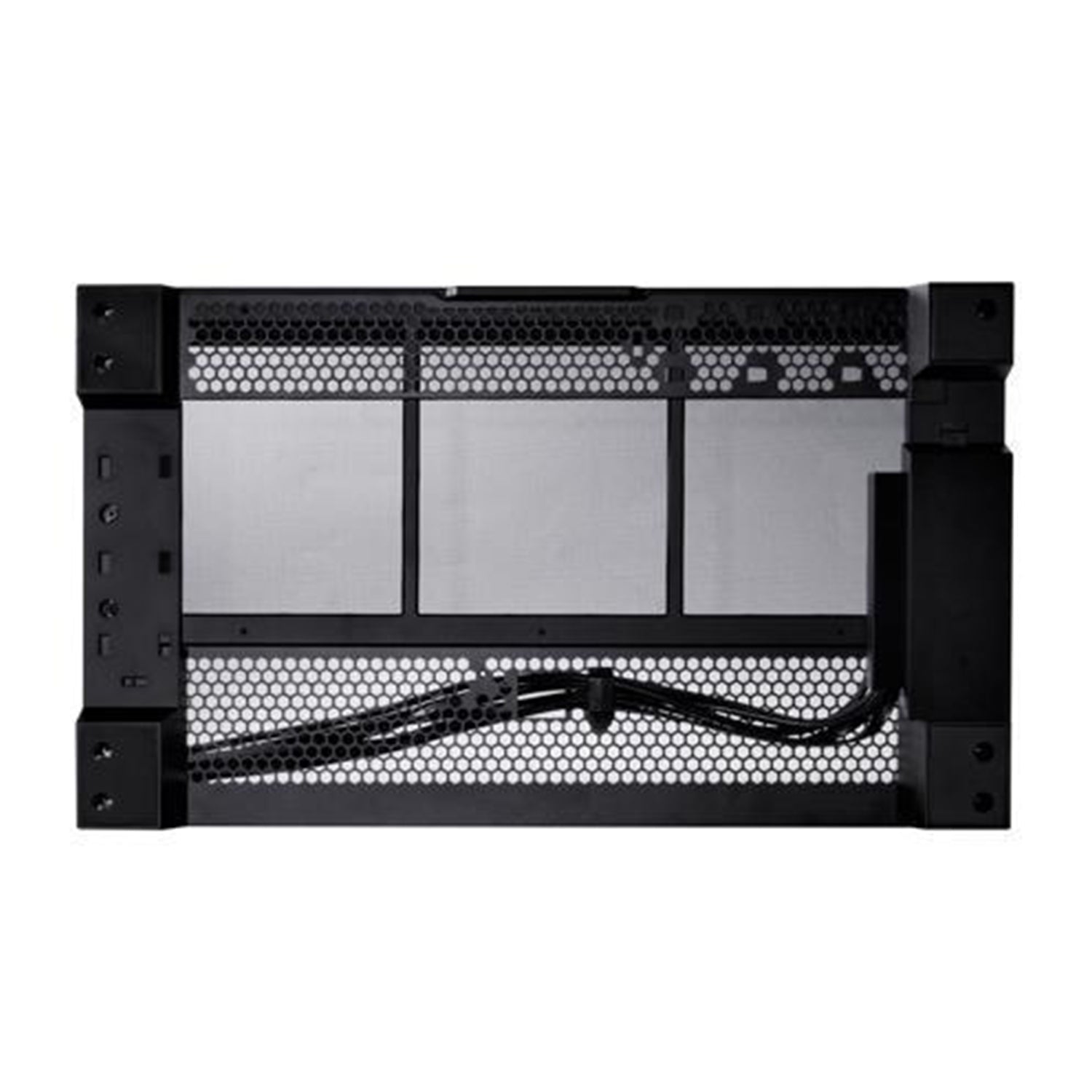 - Dual-chamber layout with cable management compartment and three cable holders.