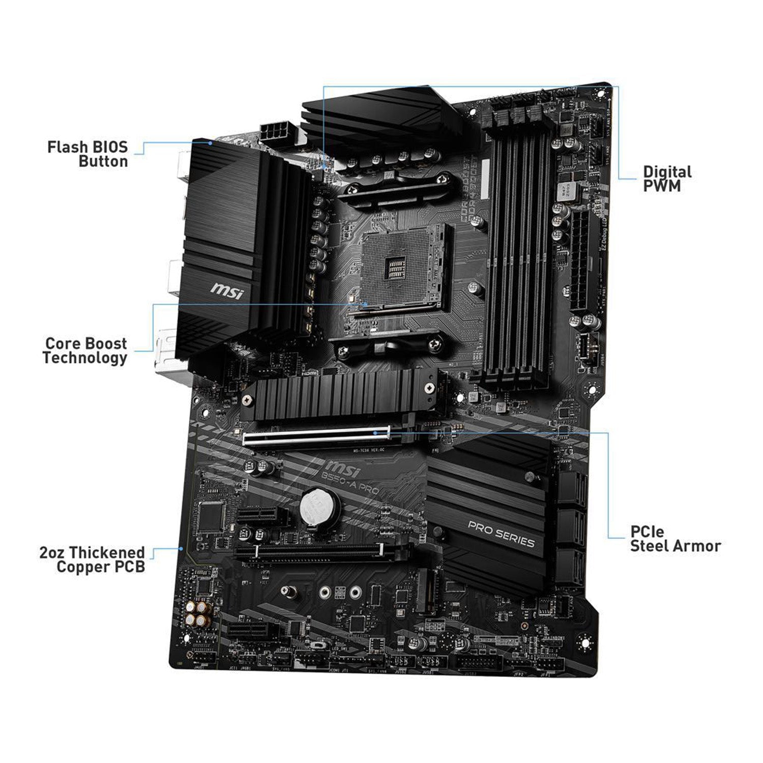MSI B550-A PRO – AM4 Socket – AMD B550 Chipset – PCIe Gen4/Gen3 – M.2 Slots – DDR4 Memory – HDMI / Display port – ATX AMD Motherboard