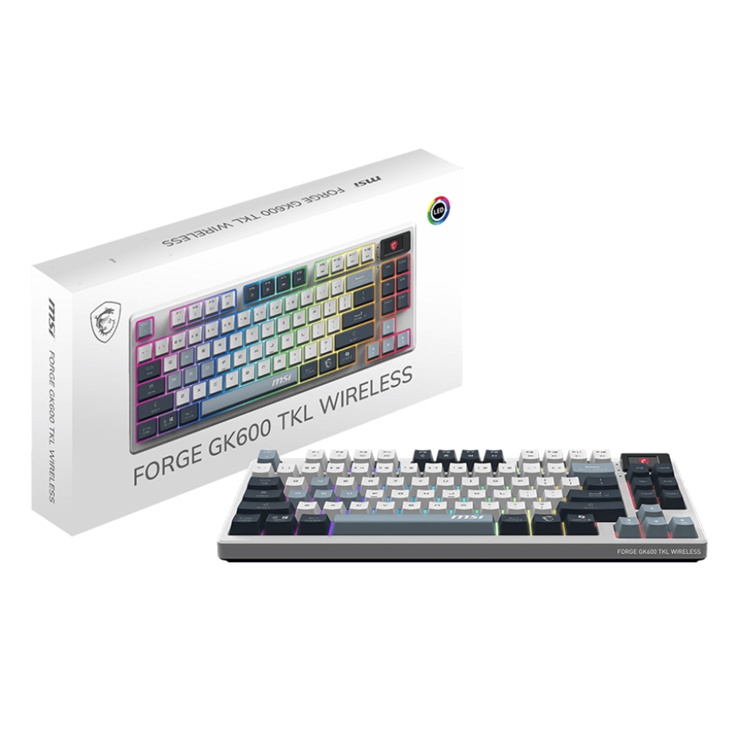 - FORCE GK600 TKL WIRELESS SKY: The MSI FORGE GK600 TKL WIRELESS offers 2.4GHz, Bluetooth, and wired modes with hot-swappable switches, PBT keycaps, and a 1.06-inch display. Its RGB lighting and 4000mAh battery make it perfect for gamers and creators