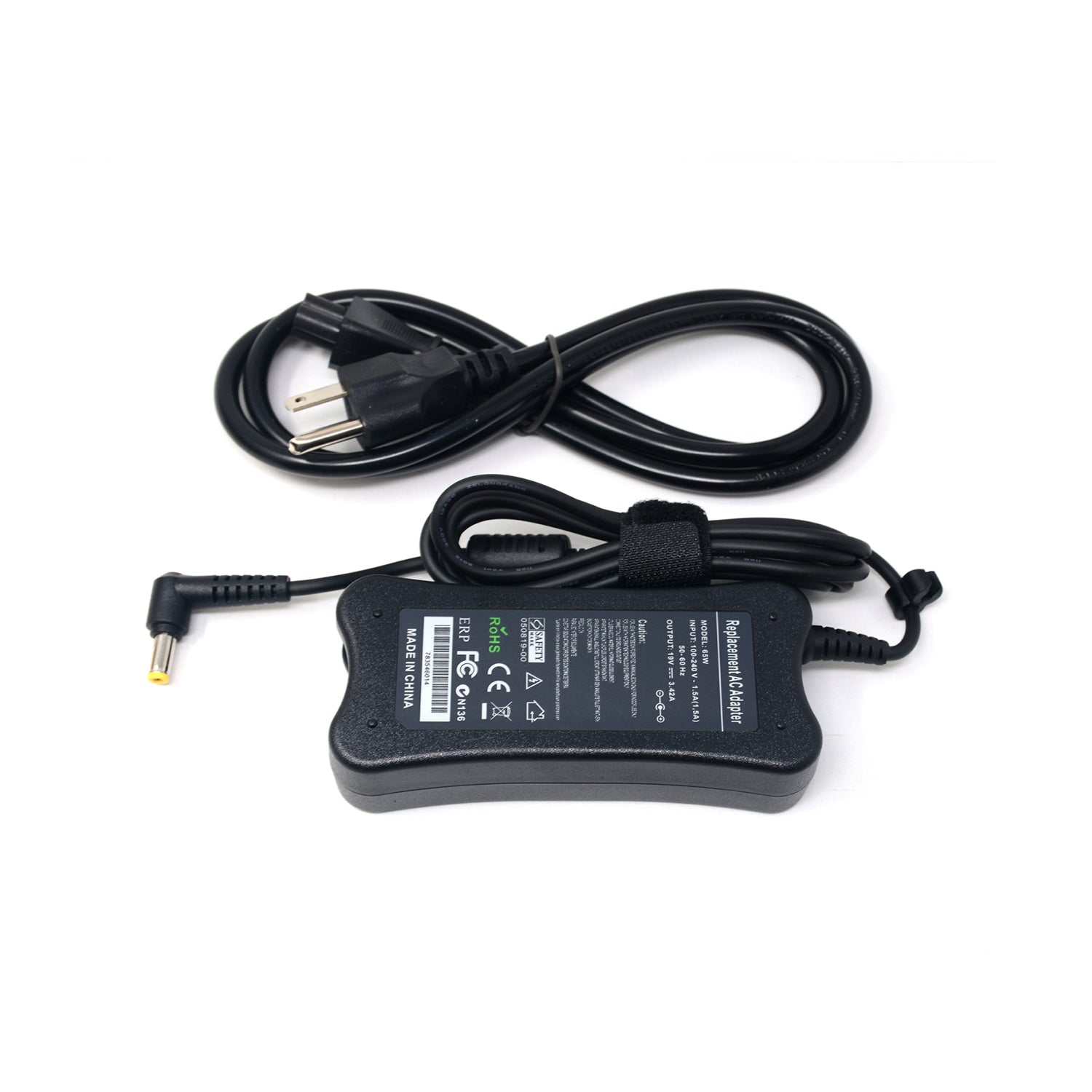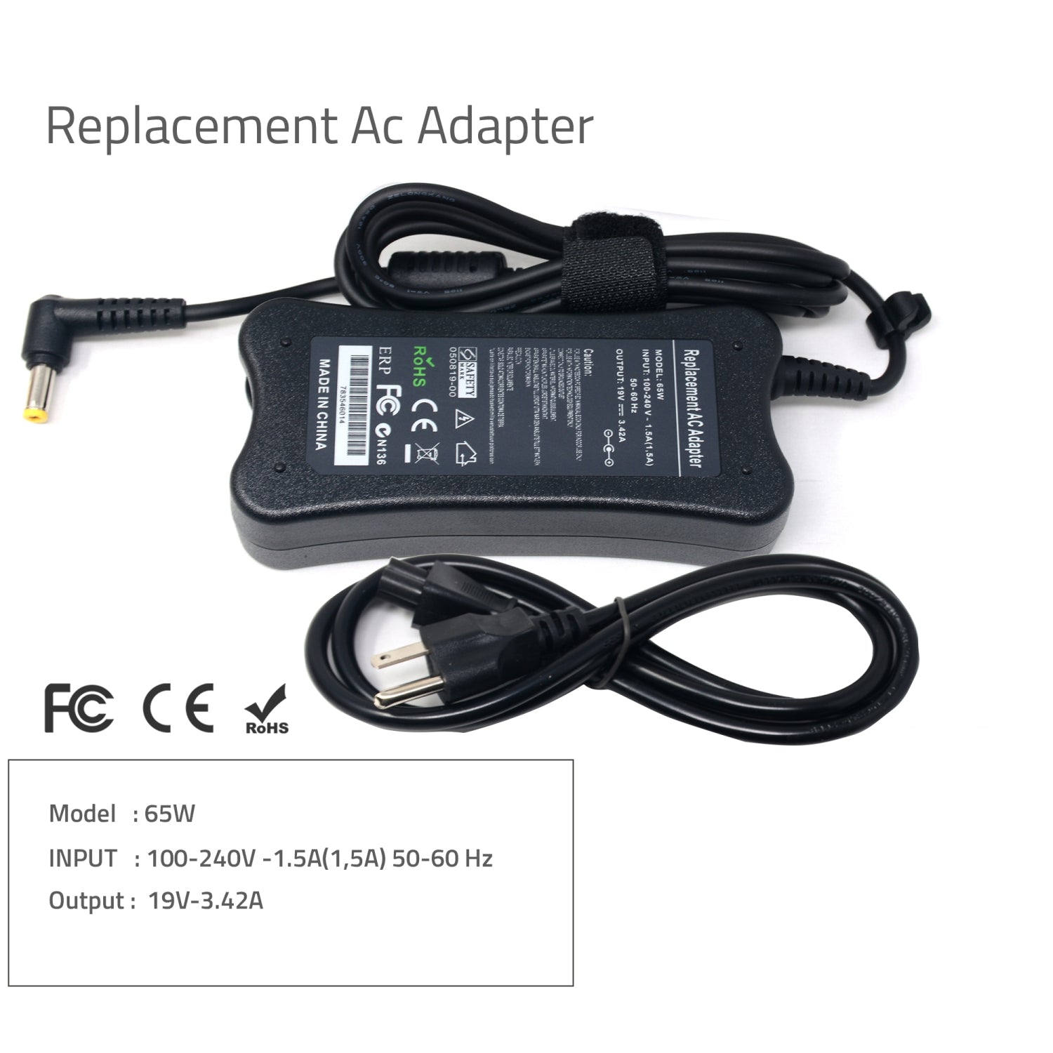 - Output: AC 19V 3.42A 65W | Connector Tip: 5.5 x 2.5